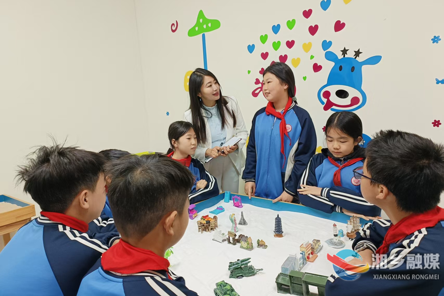 在芙蓉学校沙盘室,周成爱正轻声引导学生进行沙盘创作。孩子们自由选取模具,在沙盘中构建属于自己的“小世界”。她俯身细致观察,通过沙盘与学生对话,在轻松互动中了解他们的内心,帮助他们建立积极的自我认知。