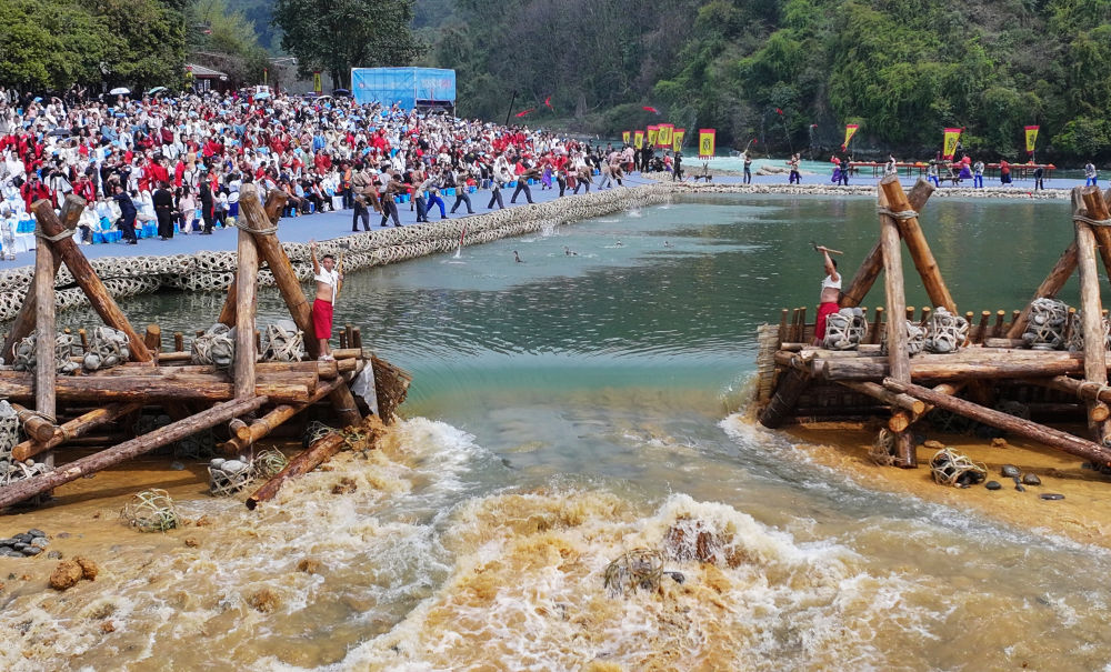 2025年4月4日都江堰放水节,堰工砍断杩槎的绳索后,岷江水奔流而下。新华社记者 江宏景 摄直与峨眉争秀色,要从灌口觅源头。