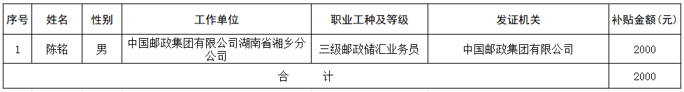 根据《湖南省人力资源和社会保障厅 湖南省财政厅 湖南省医疗保障局 国家税务总局湖南省税务局关于落实失业保险稳岗惠民政策措施的通知》(湘人社规〔2025〕9 号)文件精神,为做好我市失业保险技能提升补贴发放工作,经我局就业服务中心对申报资料进行资格初审,初认定陈铭符合失业保险参保职工技能提升补贴条件。为坚持公开、公平、公正原则,广泛接受社会各界监督,现将补贴名单及金额予以公示。如有异议,请于公示期内向我局就业服务中心如实反映,公示时间为2026年1月20日至2026年1月26日。监督电话:0731-56768137